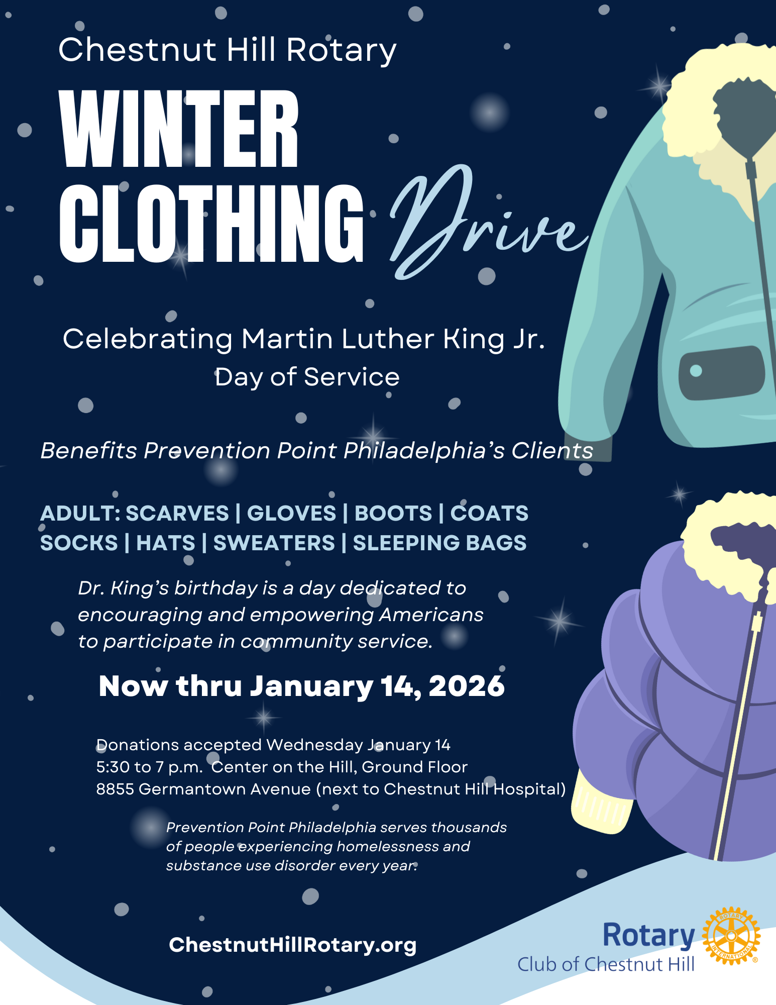 In honor of Martin Luther King Jr. Day of Service, we are collecting warm clothing for clients from Prevention Point Philadelphia. Donations can be dropped off January 14, 5:30 to 7 p.m..