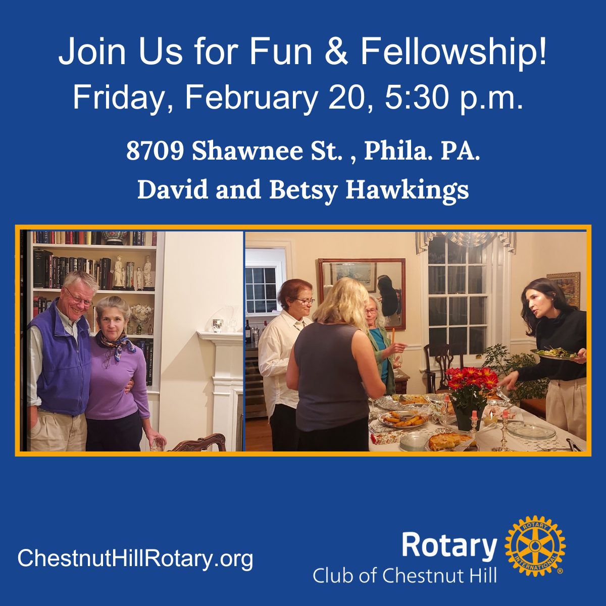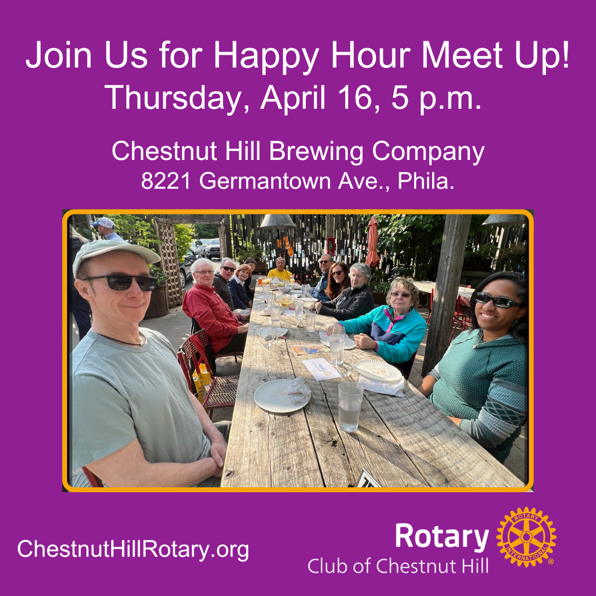 Enjoy cocktails, light food, and great conversation with members and guests of Chestnut Hill Rotary. These member-hosted gatherings are a great way to get to know fellow members and friends in a fun and informal setting.